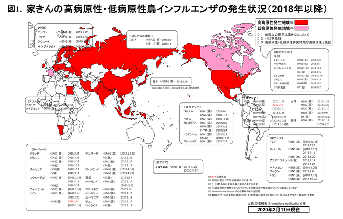2018~2019年の冬から発生は減っていますが、いまだに世界各地域で広範に鳥インフルエンザは発生しています。[図1]に最近の発生状況を示しましたが、発生していない地域が限られ、世界の家禽、水禽産業に鳥インフルエンザは大きな脅威になっています。