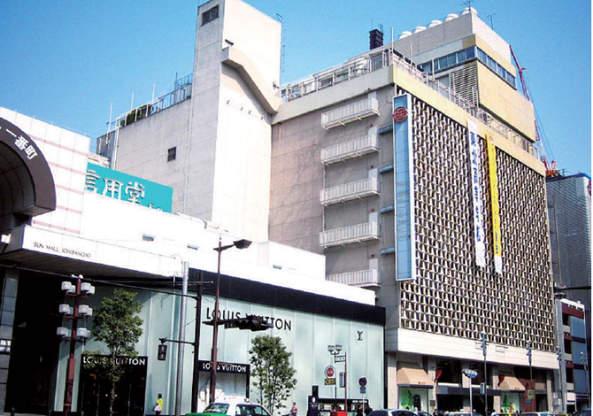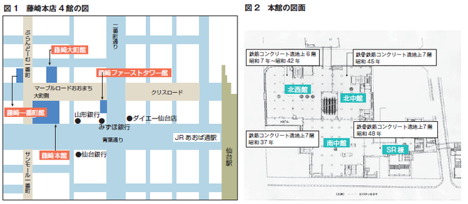 藤崎は、今年で創業193年を迎えた仙台市発祥の東北を代表する老舗百貨店。青葉区にある本店は、本館、大町館、一番町館、ファーストタワー館という4つの建物で構成され、売り場面積は東北地方で2番目の広さの3万2000平米に及ぶ(図1)。本館は、昭和7年に建設され、その後増築を繰り返し、大きく4つの建物をつなぎ合わせた複雑な構造になっている(図2)。このほか、気仙沼市や石巻市、県外など十数カ所にも小規模店舗を持つ。