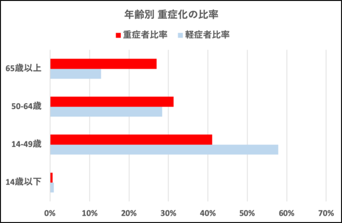 49歳以下は比較的軽症で済みますが、50歳以上は半数以上が重症化しています。もっともこれは基礎疾患と呼ばれる高齢者特有の持病が影響している可能性が高いです。
