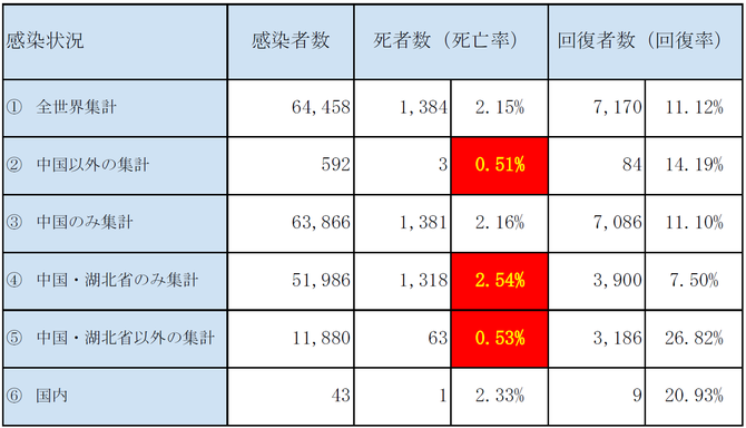 湖北省以外の死亡率は0.5%(1,000人の罹患者のうち5人前後)に収束しつつあります。季節性インフルエンザの推定死亡率0.1%に比べると5倍に達していると見ることもできます。