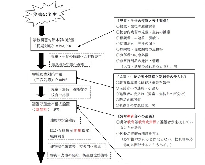災害が発生したら、まず学校災害対策本部を設置します。次に防災倉庫解錠し、避難所運営本部が設置されます。そして避難所参集指定職員の到着を原則待ち、その後食料の配給が始まるというのが通常の流れです。