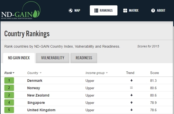 図 1 は総合ランキング表示で見た上位 5 位である(ちなみに日本は 17 位)。総合ランキングに用いられているスコアは、気候変動(およびそれに関連する自然災害)に対する脆弱性(vulnerability)と準備状況(readiness)の二つの観点から算出されており、これらはそれぞれ次のような指標を含んでいる。