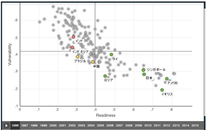 また図 2 は、縦軸に脆弱性を、横軸に準備状況をとって 2015 年の時点での各国の状況をマトリックス表示にしたものである(どの国を色付きで表示するかは自分で指定できる)。図の下端で年を選べばその時点での状況を見ることができ、1996 年を選択すると図 3 のようになる。こうして比較してみると、この 20 年間で各国の準備状況がどのくらい進んだかがよく分かる。シンガポールのように急速に向上した国もあれば、タイのように変化が少ない国もある。