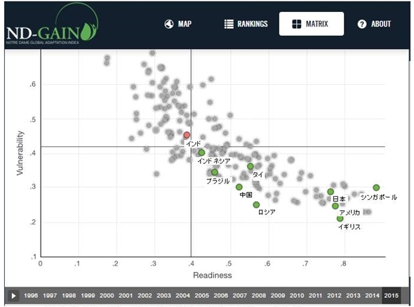 そこで今回はそのような研究成果の中から、「ノートルダム気候変動適応指標」(Notre Dame Global Adaptation Index)を紹介する。これは、米国にあるノートルダム大学で気候変動に関する普及啓発に取り組んでいる、Notre Dame Global Adaptation Initiative という研究組織(略称 ND-GAIN)が作成しているデータベースで、世界 192 カ国を気候変動に対する脆弱性と準備状況の観点から評価して公開している。Web サイト(http://index.gain.org/)にアクセスすると、現状最新版である 2015 年の時点での評価結果を、地図、ランキング、マトリックスの三通りの形で見ることができる。
