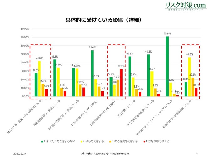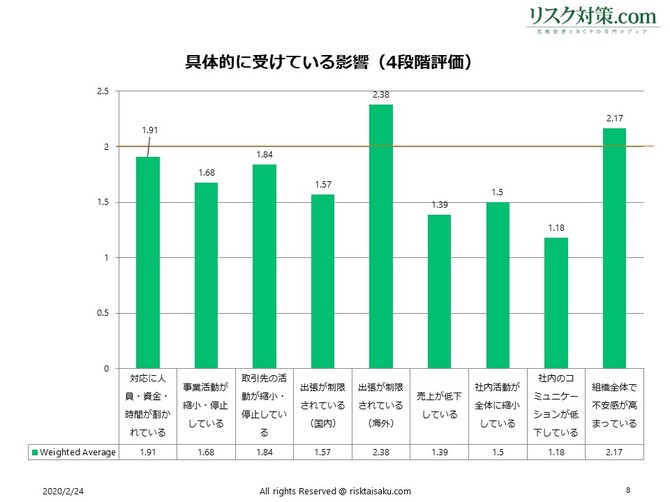 具体的に受けている影響については、1(全くあてはまらない)~4(かなりあてはまる)の4段階で該当するレベルを選択してもらったところ、「海外への出勤が制限されている」が最も高かった。次いで「組織全体で不安感が高まっている」、「対応に人員・資金・時間が割かれている」と続く。