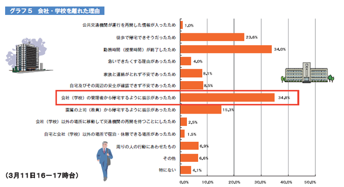 こうした傾向を反映しているかのように、企業や学校などにいた人のうち約83%が当日中に職場や学校を離れ、そのうち16−17時台に会社・学校を離れた理由として最も多かったのが「会社(学校)の管理者から帰宅するように指示があったため」(約35%)だった(グラフ5)。