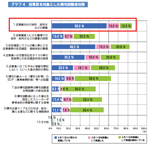 一斉帰宅を抑えるためには、社員や来訪者がその場に安全にとどまれる対策が重要で、協議会や都では、事業者に対して建物の耐震化や家具類の転倒防止を呼びかけるとともに、3日分の必要な水と食料、毛布などを備蓄することを求めている。協議会の調査結果によると、約7割の企業が何らかの従業員の備蓄を行っているが、3日分以上の備蓄を行っている企業は飲料水で約42%、食料品で約38%と半数に満たない(グラフ3・4)。
