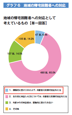 協議会が行った調査では、首都直下地震が発生した際に、地域の帰宅困難者に対して、在館者と同様に「社屋内に待機させる」よう考えている企業は約71%あるが、積極的な受け入れを考えている企業は約6%にとどまった(グラフ6)。