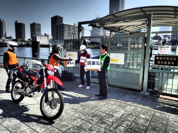 乗客を降ろした後いったん水上バスは明石町船着場を離れるが、災害対策本部から医薬品輸送の指示があったということで戻って再度接岸。製薬会社からBERTのバイクで運ばれた医薬品を受け取り、両国に出航。両国から再びバイクで医療機関に運ぶという訓練を行った。