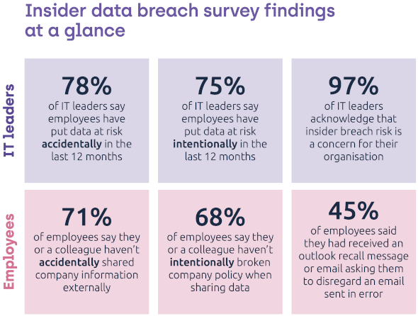 - IT Leadersの97%は、内部者による情報漏えいリスクが組織にとっての懸念であると認識しているのに対して、Employeesの45%は誤配されたメールを無視するよう頼まれたことがあると回答している。