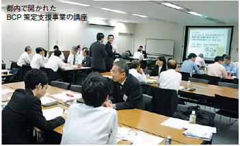 東京都では、平成22年度からBCP策定支援事業を開始しており、これまでに100社を超える中小企業が実際にBCPを策定した。初年度は35社、23年度は75社・団体が同事業に参加。24年度も現在75社・団体が参加しBCPを策定している。参加費は無料だが、トップ経営者が参画することや、経営者、事務局、現場推進メンバーの組織全体で取り組むことが条件となっている。具体的な支援方法は、初回が集合研修で、残る4回が個別訪問によるコンサルティング。訪問コンサルティングは初回から3回で、BIA(重要業務分析)やRA(リスクアセスメント)、BC戦略の決定までを行い、4回目は演習を行う。演習後には課題を抽出し、BCP文書を改善。さらに、各社がその後も継続的にBCPを維持・向上していけるよう、年間の事業計画の中に、マネジメントレビューや、内部監査、演習などを落とし込むことまでを支援する(22年度、23年度実績より)。