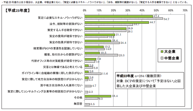 内閣府「企業の事業継続の取組に関する実態調査(平成23年11月)」の結果では、中堅企業におけるBCP未策定の理由として、「策定に必要なスキル・ノウハウがない」(54.7%)、「法令・規制等の要請がない」(33.7%)、「策定する人手を確保できない」(29.1%)、「策定の効果が期待できない」(24.4%)、「顧客、取引先からの要請がない」(23.3%)などが上位に位置付けられている。
