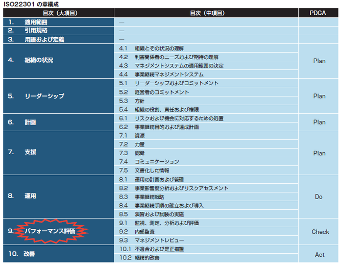 ISO22301は第1章から第10章で構成されるが、このうち要求項目は、4章(組織の状況)から10章(改善)で、この中に組織が具体的にすべき事項がまとめられている。それぞれの項目をP(計画)、D(実行)、C(評価)、A(改善)にあてはめると、4章∼7章が計画に該当し、章が実行、章が評価、8910章が改善となる(上図表)。