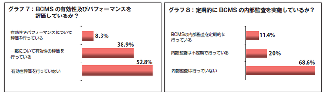 第9章については9.1)監視、測定、分析および評価、9.2)内部監査、9.3)マネジメントレビューで構成される。調査では、「BCMSのパフォーマンス評価」「事業継続手順の評価」「組織改編などの際の評価」「内部監査の有無」「トップマネジメントによるレビュー」の5問を質問。結果は5問ともすべて、「できていない」が「できている」「一部だけ、できている」を超え、最多となった(グラフ7・8)。