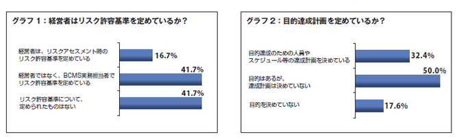 調査では全3問を質問。このうち、「経営者はリスク許容基準およびリスク許容可能レベルを定めているか」との問いに対しては、「経営者が定めている」との回答は16.7%にとどまり、「経営者ではなくBCMS実務担当者で定めている」が41.7%、「リスク許容基準について定められたものはない」も41.7%を占め、トップのコミットメントがされていない状況が浮き彫りになった(グラフ1)。