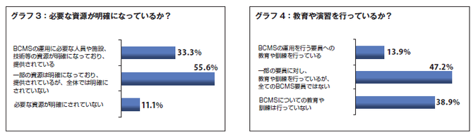 力量については「BCMS要員に必要な力量を定め、要員への教育や訓練を行っているか」との問いに、「教育や訓練を行っている」はわずか13.9%にとどまり、「一部の要員に対してのみ行っていて、すべての要員ではない」が47.2%、さらに「事業継続教育や訓練は行っていない」38.9%もあったが(グラフ4)。