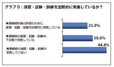 「BCMSの達成目標に合致した演習および試験を実施しているか」との問いに、「評価のために定期的に訓練している」との回答はわずか25%で、「演習・試験・訓練は実施していない」との回答が44.4%で最多となった(グラフ5)。一方、避難訓練・災害対応訓練については、すべての回答企業・団体で取り組まれている。事業継続訓練を実施したことがある企業・団体と比較すると、取り組みには倍近くの開きがあることがわかる(グラフ6)。森氏は「事業継続訓練が実施できていない背景には、事業継続訓練の必要性が認識されていない、BCMSの意識が弱い、訓練を実施するスキルが無いなどの理由があると想定されるが、事業継続訓練は、“評価”を行うポイントの1つであり、BCPが本当に有効なものであるかを確認するためにも確実に行うことが重要である」と話している。