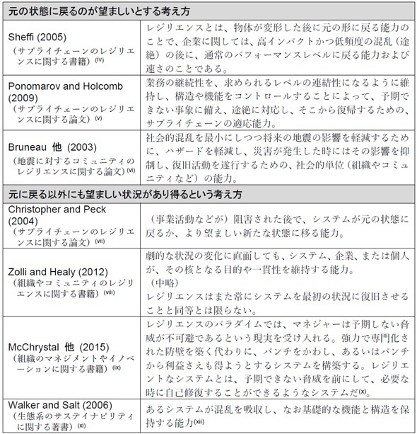 次表は様々な論文や書籍におけるレジリエンスの定義を、筆者がこれまでにアクセスした範囲でまとめたものである。整理のしかたについても様々な軸があり得るが、次表はレジリエンスを発揮した結果として、どのような状態になるのが望ましいと考えているか、という観点でまとめてみた。