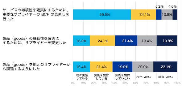 また図2はサプライチェーンの途絶に関連する施策の実施状況である。「主要なサプライヤーのBCPの見直しを行った」という設問については、原文では「review」と書かれているのを「見直し」と訳させていただいた。従って単に内容を再確認したもの(必ずしも内容の更新などを伴わない)が含まれている可能性がある。しかしながら、いずれにしてもサプライヤーの事業継続性に対する関心が高く、その関心が行動につながっていることが分かる。また4割程度の組織が実際にサプライヤーを変更したか、変更を検討していると回答している。