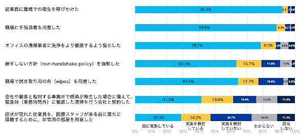 まず図1は、保健衛生施策(health and hygiene measures)の実施状況である。握手しない方針(non-handshake policy)というのは日常的に握手をする欧米ならではだが、感染者が発生した場合の清掃を行う会社と契約したという回答が約4割、隔離のための部屋を用意したという回答が約3割というように、有事を想定した準備をしている組織が一定数あることは注目に値する。