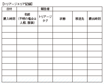 このシリーズで繰り返し強調していることだが、処置エリアにおいてもICS(インシデント・コマンド・システム)のルールに則り、訓練を受けた適任者がリーダーとなり、「要救助者が適切に配置されているか?」または、「全身観察が正しい手順にそって行われているか?」などを確認しながら活動現場全体を機能的にマネジメントしなければならない。また、下記項目についてもリーダーは「詳細に記録を書面に残しているか?」という観点からも確認も怠ってはならない。
