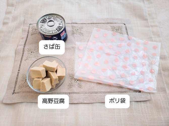 備蓄できるさば缶と高野豆腐を使います。カセットコンロとポリ袋でご飯までつくっちゃいましょう。