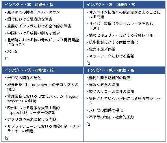 調査にあたっては、まず外部で広く公開された情報から、今後発生すると考えられるリスク、脅威、およびハザードを 80 項目(注 5)リストアップし、各項目に対して committee メンバー各自が、インパクトの高さと可能性の高さから、それぞれ 5 段階評価を行い、その平均点によって順位をつけている。さらに、インパクトの高さに対する平均点と可能性の高さに対する平均点とを掛け合わせ、若干の重み付けを行ったものをリスクスコアとしている。なお下の図 1 はこれらをインパクトと可能性の 2 軸で分類した例として、本報告書に掲載された図である。