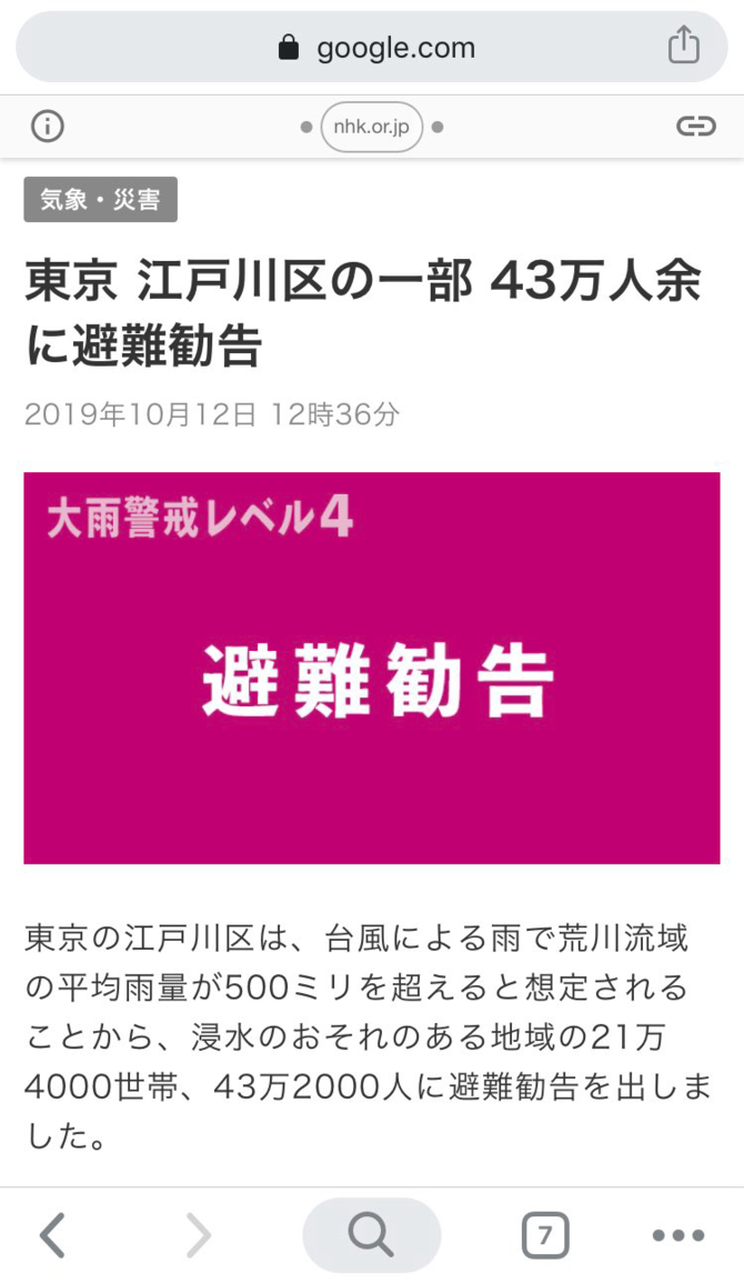 この報道を見ると、「台風による雨で荒川流域の平均雨量が500ミリを超える」と予測されたために避難勧告が発令された、とあります。