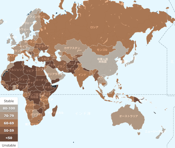本稿のトップに掲載した図は各国・地域ごとのリスクを総合的に評価した結果である「Country/Region Risk Index」を色分けして示したものである。レイアウトの都合上、図が小さくなってしまって見にくいと思われるので、詳しく知りたい方は本稿の最後に記載した「報告書本文の入手先」にアクセスしてオリジナルの方をご参照いただきたい。濃いめの緑色の部分(グリーンランドやスウェーデン、ノルウェーが該当)が最も安定(Stable)、赤色の部分が最も不安定(Unstable)と評価された国・地域である。