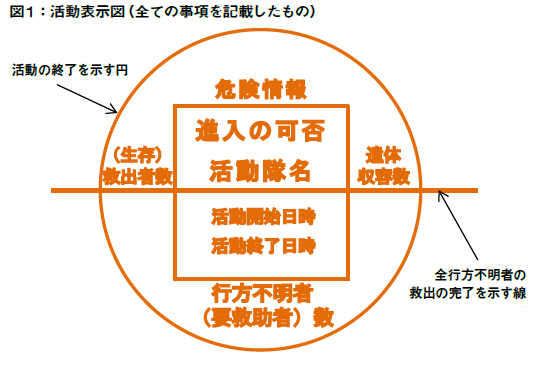 イ) 活動の終了(円):活動を終了し撤収する場合は、手順4までに表記した標示全体を囲む円を描く。行方不明者の総数が不明のまま撤収する場合や、要救助者が確認されているが自己隊の資機材等では救出ができないまま撤収する場合にも、活動終了を示す円を描く。