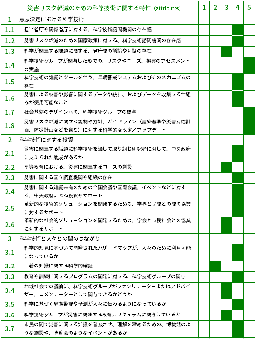 まず本報告書の前半部分では、災害リスク軽減における科学技術の状況が、国ごとに(注 2)それぞれ 4 ページにまとめられており、日本に関する評価結果は表 1 のようになっている。これらは国内の複数の研究者に対するインタビューなどを中心とした調査の結果を踏まえてまとめられている。