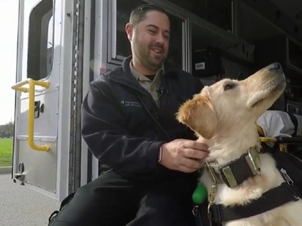 1歳のゴールデンレトリーバーとラブラドルのミックスでメスのスターは、飼い主で救急救命士(パラメディック)のルイ・ベルオミニさんと一緒にProMedicaの救急車に乗って、働いています。