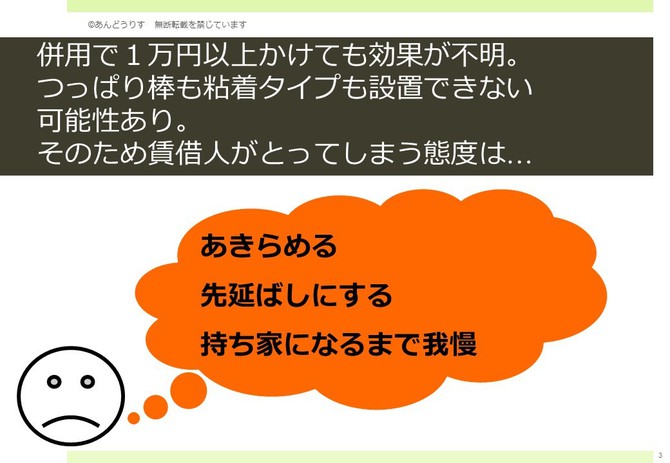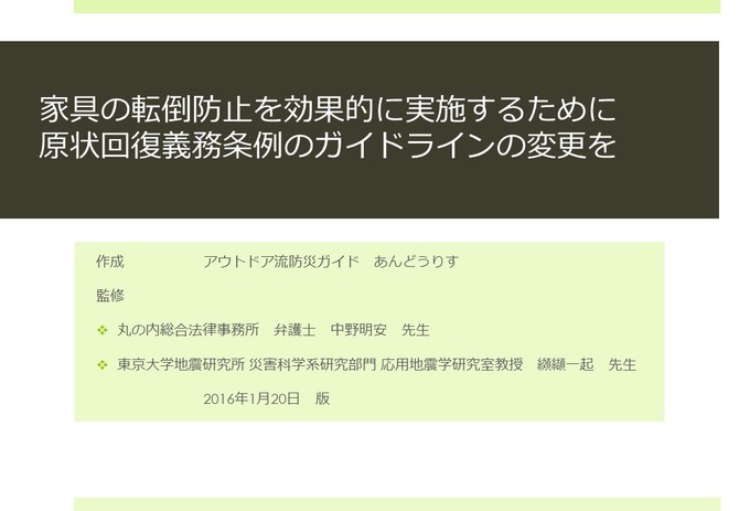 きっかけは、この想いにつきます。家具の転倒防止をしないのは、やらない人の意識の問題にされる事が多かったのです。でも、賃借人には原状回復義務があるから、転倒防止ができません。それならば、いくら啓蒙しても転倒防止は実施されません。根本的な解決をしないと!