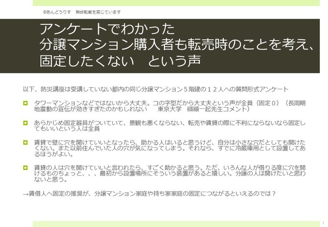 しかも最初は、家を借りる人だけが転倒防止を実施していないと思っていたのですが、持ち家の人も転売の際に評価が落ちることを気にして、実施していないことがわかりました。マンションが多い都市部ではなおさらです。