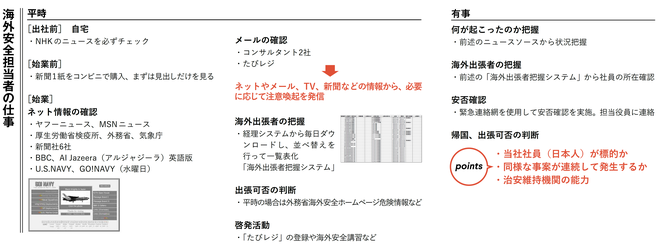 同社の海外安全マニュアルは、基本的にはテロや戦争を想定している。もちろん特別な情報網があるわけではない。テレビや新聞、インターネット、メール(配信サービス)などから得られる情報を用いて各地域の状況を把握。情勢を予測してリスクを評価し、事が起きれば出張や帰国の可否を判断する。