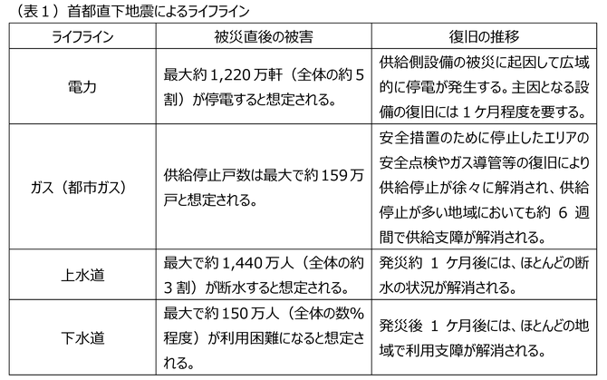 例えば、首都直下地震では次のような被害想定が出されています(表1)。