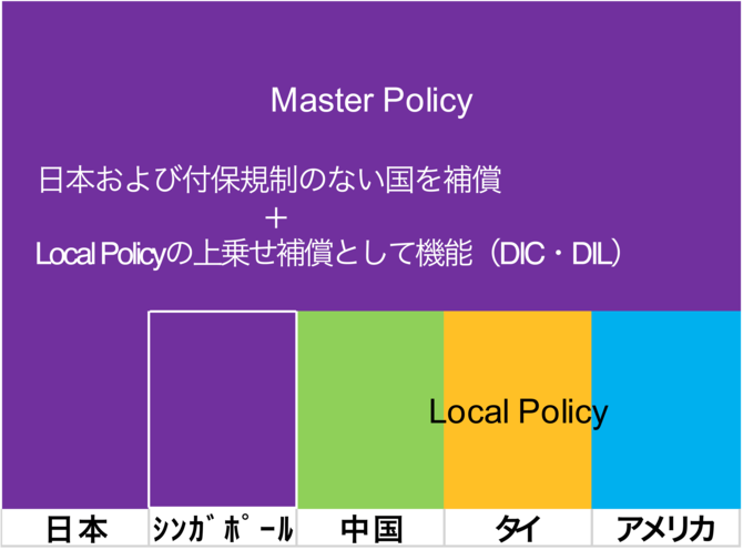 親会社が全世界の子会社を含むグループ全体の補償内容を決定し、包括的な保険契約Master Policyを締結するものです。さらに、どの子会社でLocal Policyを発行するか? Local Policyの補償はいくらまでにするか?などは全て親会社が決定し子会社に通知して、子会社はその通知に従い現地でLocal Policyを契約することになります。