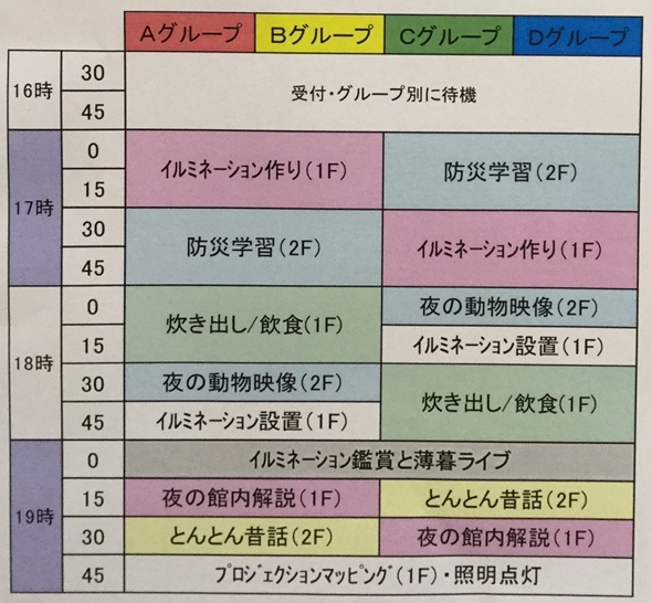 「本館は災害時の避難場所になっているため、防災イベントを検討しておりました。ただ、閉館後でないと多くの参加者を対象としたイベント実施が難しいので夜に行うというのが前提条件でした。夜にやるのであれば楽しくリアルに学べるものにしたいと考え、懐中電灯持参やイルミネーション作りや動物の生態映像、暗闇での昔話などを組み込んでいった結果ということです。炊き出しは手間と衛生面で悩んだ末にレトルト対応としましたが食事がセットになっているということでお母さん方には喜ばれたのかなと思います」