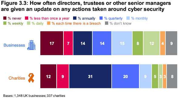これと関連して、取締役や理事、上級管理職に対して、サイバーセキュリティーに関連して実施された事項を報告する組織も増えている。図1はそれを企業(Businesses)と慈善団体とに分けて表したものである(2019年版の紹介の時にも同じ図を掲載させていただいた)。