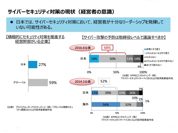 経営者のサイバーセキュリティ意識を調査すると、セキュリティ対策を推進する経営幹部がいる企業は日本で27%、グローバルなら59%です。また、サイバー攻撃の予防を取締役会で議論すべきと答えたのは「どちらかといえば」を含めても68%であり、まだまだリスク認識が足りないと言えます。