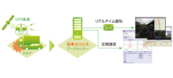 通信機能のないドライブレコーダーで映像を確認する場合は、内蔵されたSDカードを取り出す必要があるので、毎日運行する社用車の場合、運行映像を見直すには手間がかかっていた。ドライブレコーダー内のセンサーが急ブレーキなどの危険運転を検知、携帯電話の通信回線を経由して危険運転時の映像を管理者へメールで通知するので、管理者は見る必要のある危険運転のみを簡単に確認できる。
