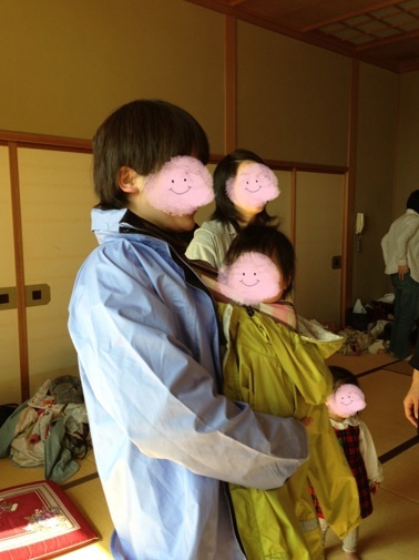 ジッパー(ファスナー)の規格が同じであれば、大人用と子ども用をジョイントさせて、ママコートにすることができるのです。子どもが赤ちゃんの時に発見しました。歩けるようになったら普通のレインウエアとして着せたので、6歳まで同じレインウエアを使い倒すことができたのです。そうすると、高いお買い物でも長く使えばトータルのコストは変わらないですよ、かさばる上着を減らせるから転倒する家具も不要になりますよっていう小技です。