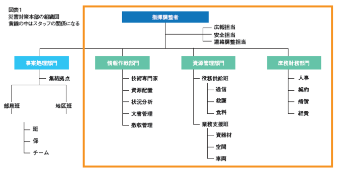一方、(スタッフ)参謀というのは、指揮官をサポートするための情報作戦部門や資源管理部門、庶務財務部門がそれにあたる(図表1)全員で現。場に行って災害対応にあたるのではなく、トップリーダーが機能するためには、計画を立てる、資源を整える、書類を管理するという後方支援的な任務が重要な要素になるということだ。