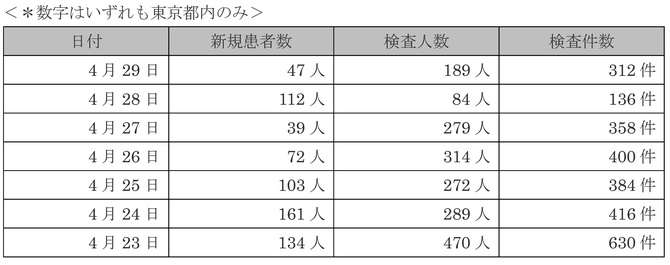 毎日公表されている新規感染者数とは、PCR検査を実施して「陽性」と判断された人数が公表されているのは周知のことと思いますが、問題は「どれくらいの検査を行った結果、陽性と判断されたのが何人だったのか?」と把握することではないでしょうか。例えば上記の東京都のサイトでは、「陽性患者数」「患者の属性(居住地、年代、性別)」「区市町村別の患者数」「検査人数」「検査件数」などの数字が日々公表されていますが、直近1週間の新規患者数と検査人数、検査件数は以下のようになっています。