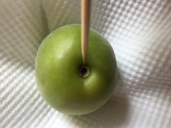 まず水洗いした梅のヘタを採ります。つまようじでヘタを刺してねじると、つるんと採れます。この時、水分が残るとカビや腐敗の原因になります。しっかり水分が乾くまで待ちます。その後、アルコール濃度の高い焼酎で消毒かわりに拭く方もいます。焼酎によって、塩をまぶしやすくする効果がありますので一石二鳥なのです。