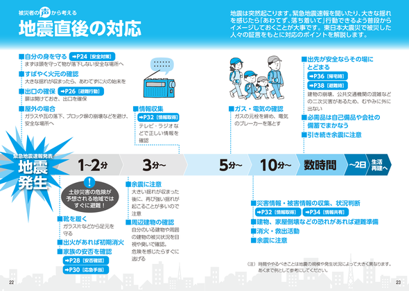 毎年大好評のこのシリーズ。被災直後の対応では、東日本大震災や熊本地震で実際に課題になったことを例に、地震発生後から避難、避難生活、その後の復旧・復興まで、何が必要になるのかをイラスト付きで段階的にわかりやすく整理しました。緊急時や被災時に活用できるツール、法制度、ホットラインなど、役に立つ情報が満載です。