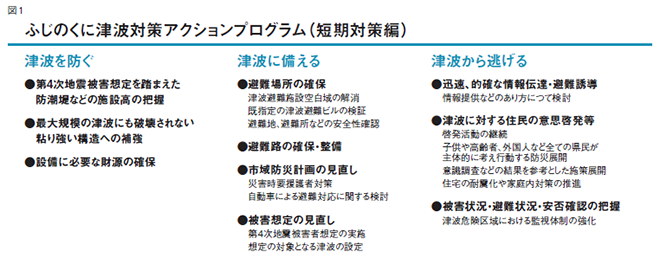 短期対策については、2011年9月に「ふじのくに津波対策アクションプログラム(短期対策編)」として、「津波を防ぐ」「津波に備える」「津波から逃げる」の3つの観点から26のアクションにとりまとめ、実施可能な対策から着々と実施してきた(図1)。