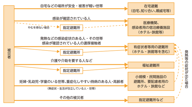 新型コロナウイルス感染者はできるだけ早く、医療機関や宿泊療養施設(ホテル・旅館等)などに移送することが重要だが、発災直後の被災地では医療機関、ホテルが被災して傷病者を受け入れられないことがよくある。そのため、やむを得ず避難所を一時的な滞在場所として活用せざるを得ない。