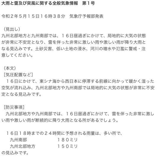 あまり知名度がない情報かもしれないので、実際に発表された例を見てみましょう。下の例は令和2年5月15日に発表された全国レベルの「気象情報」です。