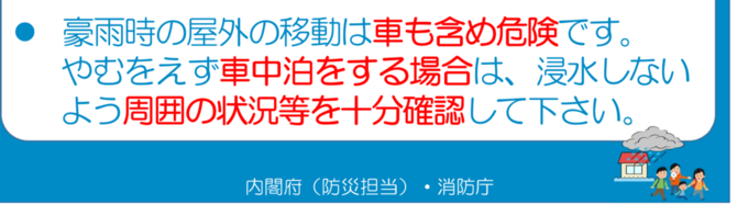 また内閣府の資料では、豪雨になってしまってから車での避難が危険になることも当然の前提として書かれています。前見えないですから。